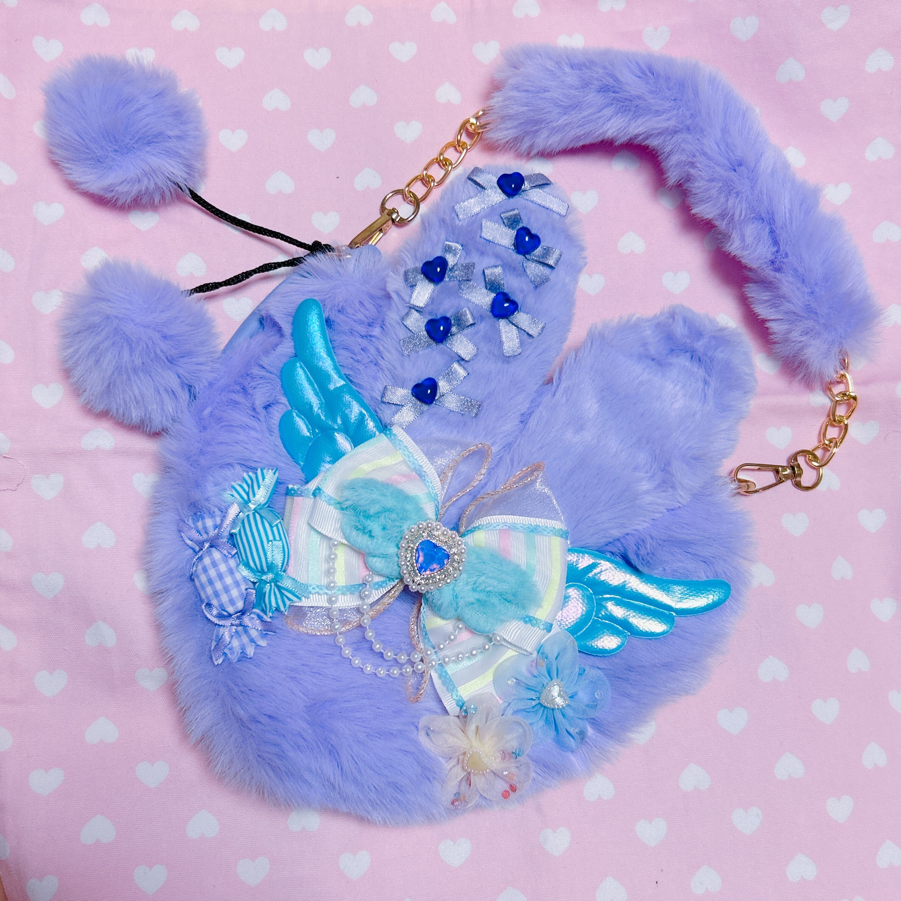 ゆめかわ、ファンシーなイメージを詰め込んだバッグなので大きなリボンや、羽のモチーフ、うさ耳の小さなリボンや、キラキラビジューなど可愛いがてんこ盛りです!!